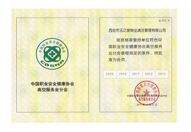 2012年我公司經(jīng)資格審核成為中國職業(yè)安全健康協(xié)會(huì)高空服務(wù)業(yè)分會(huì)的會(huì)員。,特發(fā)了高空清洗懸吊作業(yè)企業(yè)安全生產(chǎn)證書。